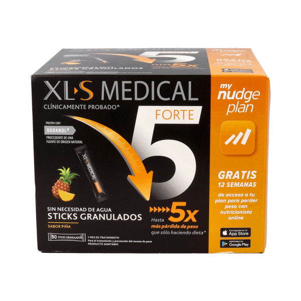 XLS Medical Forte 5 Sabor Piña 90uds es un complemento alimenticio en formato granulado en sobres monodosis diseñado para facilitar la pérdida de peso, gracias a su fórmula a base del complejo de fibra okranol, de origen natural.Indicado para adultos en proceso de pérdida de peso. No apto para niños.