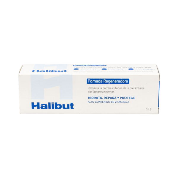 Halibut® pomada regeneradora 45gr es un producto que incrementa la síntesis del colágeno en la piel y colabora en el proceso de cicatrización. Ayuda a estimular la regeneración de las células dañadas gracias a la vitamina A y el óxido de zinc, que a su vez fomenta la creación de una barrera protectora, lo que aísla la epidermis de los agentes externos que puedan irritarla. Por último, la lanolina ayuda a evitar el exceso de humedad, lo que previene la aparición de futuras rozaduras o escoceduras y hace que la piel se mantenga más suave. Además, tiene poder hidratante y reparador. Indicado para pieles frágiles y sensibles de adulto. Ideal para el tratamiento de irritaciones, rozaduras, escoceduras, quemaduras y cicatrices.