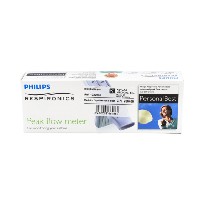 Dispositivo de medición de flujos respiratorios para adultos. Fácil de usar y guardar. Con un diseño ligero y portátil que hace que los pacientes tengan el monitoreo de flujo máximo en la punta de los dedos, en todo momento. De la marca Philips, con indicadores de diferentes colores definiendo tres zonas que facilitan al usuario encontrar el porcentaje de flujo pico que tiene en ese momento.