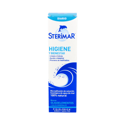 Sterimar Higiene y Bienestar 100ml es una solución fisiológica de agua de mar, que añade a las propiedades del suero fisiológico las propiedades de los minerales y oligoelementos marinos.El envase cuenta con una boquilla especialmente diseñada para un efecto de suave y fina microdifusión de gotitas. Actúa de forma eficaz contra la congestión nasal, y puede utilizarse por toda la familia.