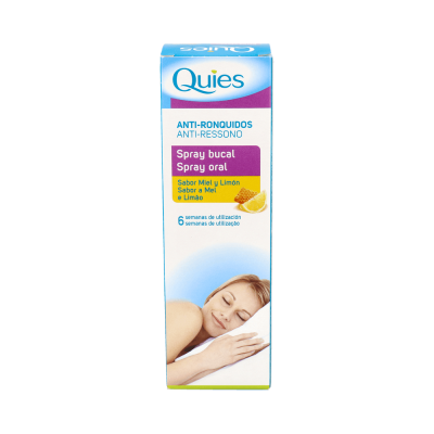 Los ronquidos se producen porque las vías respiratorias se encuentran obstruidas. Si padeces de ronquidos es conveniente abrir las vías respiratorias para un mejor descanso para ti y para los que te rodean. Muchas veces cuando dormimos, los tejidos del final de la garganta se relajan y cuando pasa el aire, vibran, causando el ronquido. El spray antirronquido Quies actúa directamente sobre los factores que causan el ronquido. Gracias a su fórmula con goma xantana, el paladar se lubrica y se evitan las vibraciones cuando se respira. Además, no hay peligro de que se reseque la garganta ya que se mantiene un buen grado de humedad durante toda la noche. *Sabor a miel y limón. Olvídate de los ronquidos y descansa como te mereces.