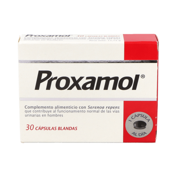 Proxamol 30 Cápsulas complemento alimenticio en forma de cápsulas con extracto lipídico del fruto de Serenoa Repens que colabora en el buen funcionamiento urinario de los hombres. Actúa sobre la hiperplasia próstatica benigna y alivia sus síntomas. Además, contiene propiedades para calmar los síntomas de la micción que causa la hiperplasia prostática benigna.