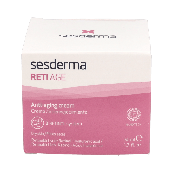 Sesderma Reti Age crema facial 50ml es una crema facial antienvejecimiento indicada especialmente para pieles secas. Es una crema antiage que previene y corrige los signos de la edad como las líneas de expresión, las arrugas, la perdida de elasticidad, la luminosidad y la tonicidad. Su excelente formula combina el ácido hialurónico hidrolizado y el factor de crecimiento TGF- 2 para potenciar sus efectos. Posee una potente acción antioxidante con una excelente tolerancia, debido a su Sistema 3-Retinol de liberación sostenida. ¿Qué aporta Sesderma Reti Age crema facial? Los retinoides que contiene estimulan la proliferación de los queratinocitos. Proporciona una suave exfoliación. Mejora la textura y tono de la piel. ¡Sesderma Reti Age crema facial contribuye para disimular todo signo de edad de tu piel y dejála que luzca lisa y tonificada!
