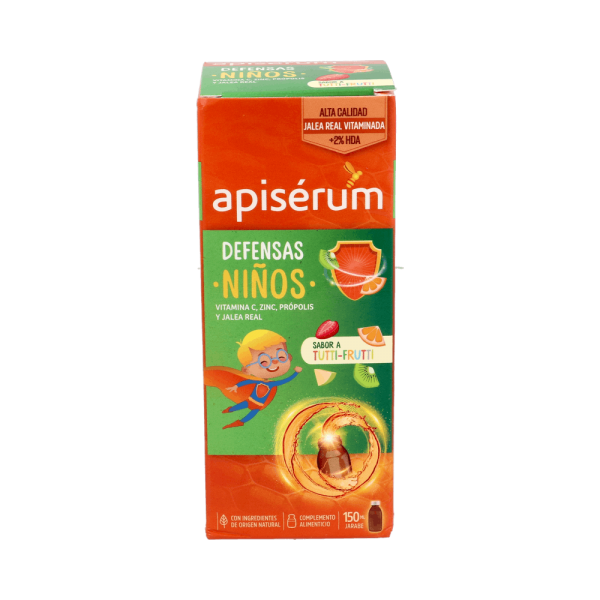 Complemento alimenticio en formato líquido, elaborado a base de jalea real, ácidos grasos omega 3, vitamina C, zinc, própolis y agradable sabor a tutti fruti, que está especialmente desarrollado para ayudar a reforzar el sistema inmunitario de los más pequeños de casa.Gracias al zinc y la vitamina C, también contribuye a disminuir el efecto de los radicales libres sobre el organismo.