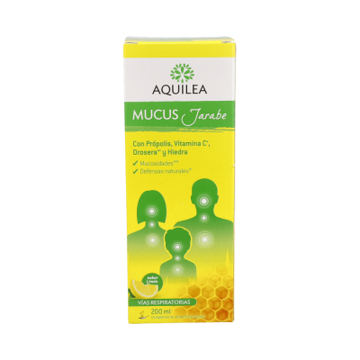 Aquilea Mucus Jarabe 200ml es un complemento alimenticio a base de própolis, vitamina C, drosera y hiedra que ayuda a regular el nivel de mucosidad y a eliminar la congestión nasal.Asimismo, su fórmula contribuye a proteger el sistema inmunitario y las vías respiratorias.Indicado para niños (a partir de los 3 años) y adultos. Sin gluten y sin lactosa.