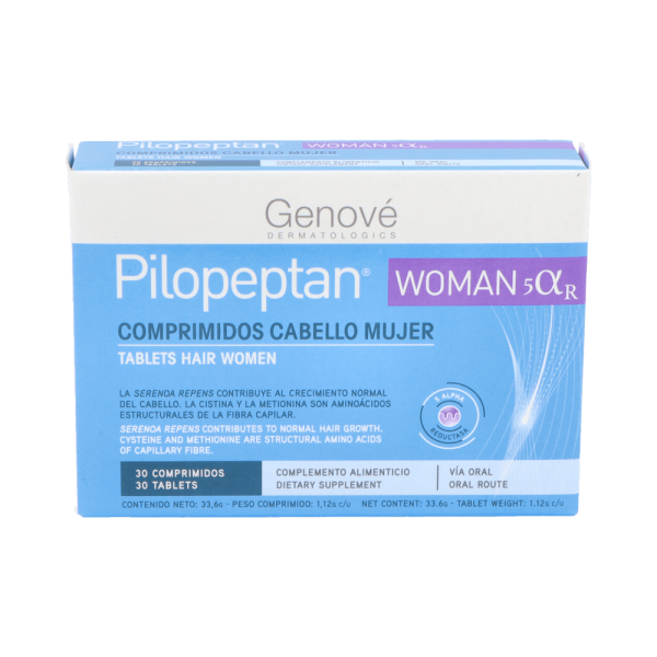 Pilopeptan Woman 5AlfaR 30comp es un complemento alimenticio en formato de comprimidos que disminuye la caída androgénica del cabello en las mujeres. Aporta vitaminas, aminoácidos y minerales que necesita el organismo para tratar la caída y la debilidad del cabello.Sus componentes principales son: Aminoácidos azufrados, gelatina hidrolizada y zinc, que ayudan al mantenimiento normal del cabello. Además, incorpora ácido hialurónico, que mantiene niveles óptimos de hidratación y elasticidad y vitaminas del grupo B, que ayudan a combatir el estrés y nutren el folículo piculoso.Sin Lactosa. Apto para intolerancias a la leche, huevo y/o soja.