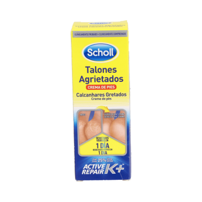 Scholl Crema Talones Agrietados 60ml es una crema que ayuda a regenerar la piel de los talones gracias al principio activo Active Repair K+, que se nutre de los beneficios de la keratina y la urea, que además de proporcionar una hidratación intensa ayuda a proteger los pies de las infecciones. Indicada para usar en talones que presentan un aspecto descolorido con fisuras o grietas verticales.